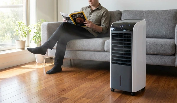 The portable evaporative air cooler is a smart, affordable, and energy-efficient cooling solution that does not require a large vent tube to be placed in a window and is easy to move from one room to another. It is simple to use; just plug it in, add water, and it starts cooling.